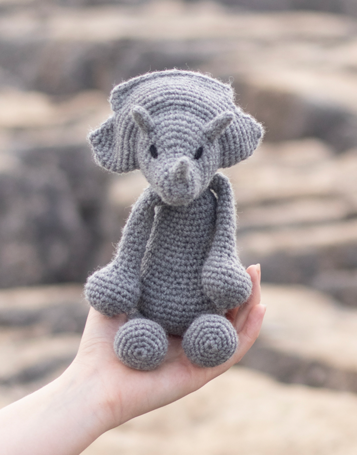 COLOUR CHOICES: This Triceratops dinosaur crochet pattern is shown here using Shale wool.