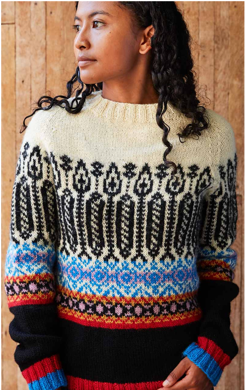 • Valdres Pullover. A completely modern take on traditional Norwegian design, this is the sort of treasure to knit and love forever. We love the mix of colors and pattern here, full of surprise and fun. The hem-up construction, ending in a raglan construction at the shoulders, makes for stranded knitting in the round that is mesmerizing and surprisingly easy to keep track of. The black-and-white stitch pattern is so cool. And the bands of solid color provide a break along the way.