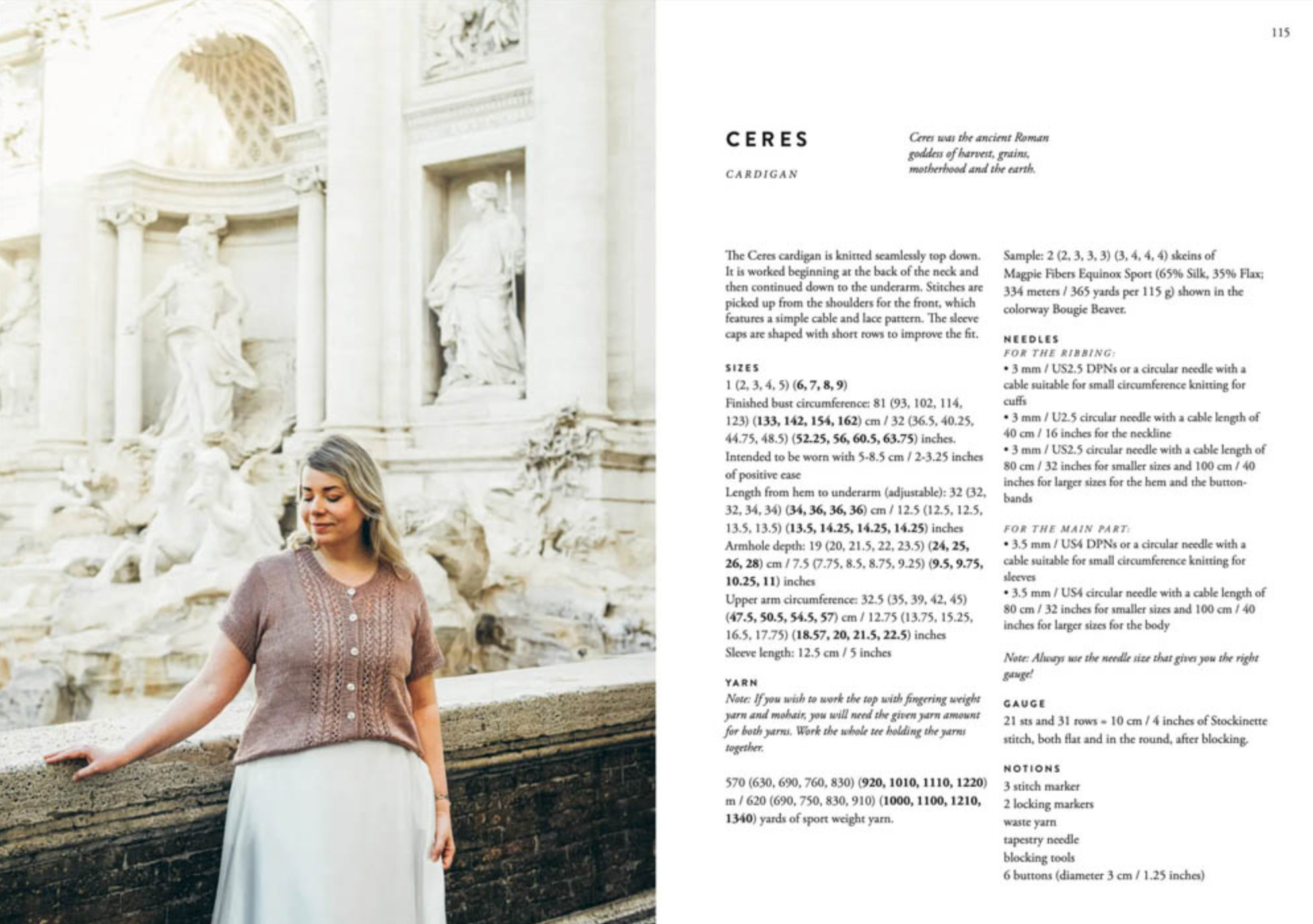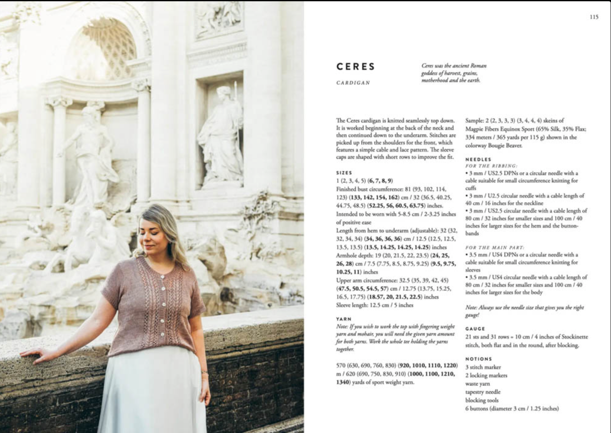 Each design is inspired by an ancient Roman goddess, capturing the timeless beauty of its namesake. Sari’s clear instructions and attention to detail make these patterns accessible to knitters of all levels.